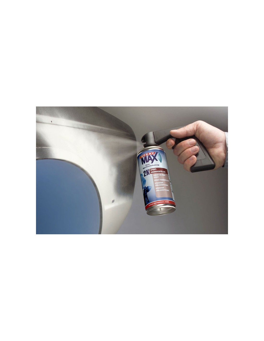 Spray paint-can aerosol hand-grip for simple and familiar handling while painting with SprayMax or other spray paint can products. The hand grip facilitates painting hard to access painting points such as the inside edges in the door entrance area.